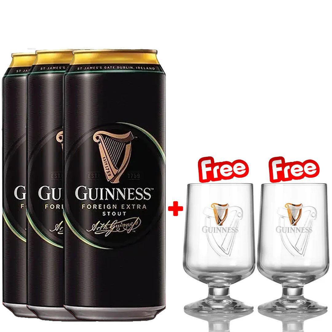 This offer includes three 500 ml bottles of authentic Irish Guinness stout plus two official Guinness-engraved glasses.